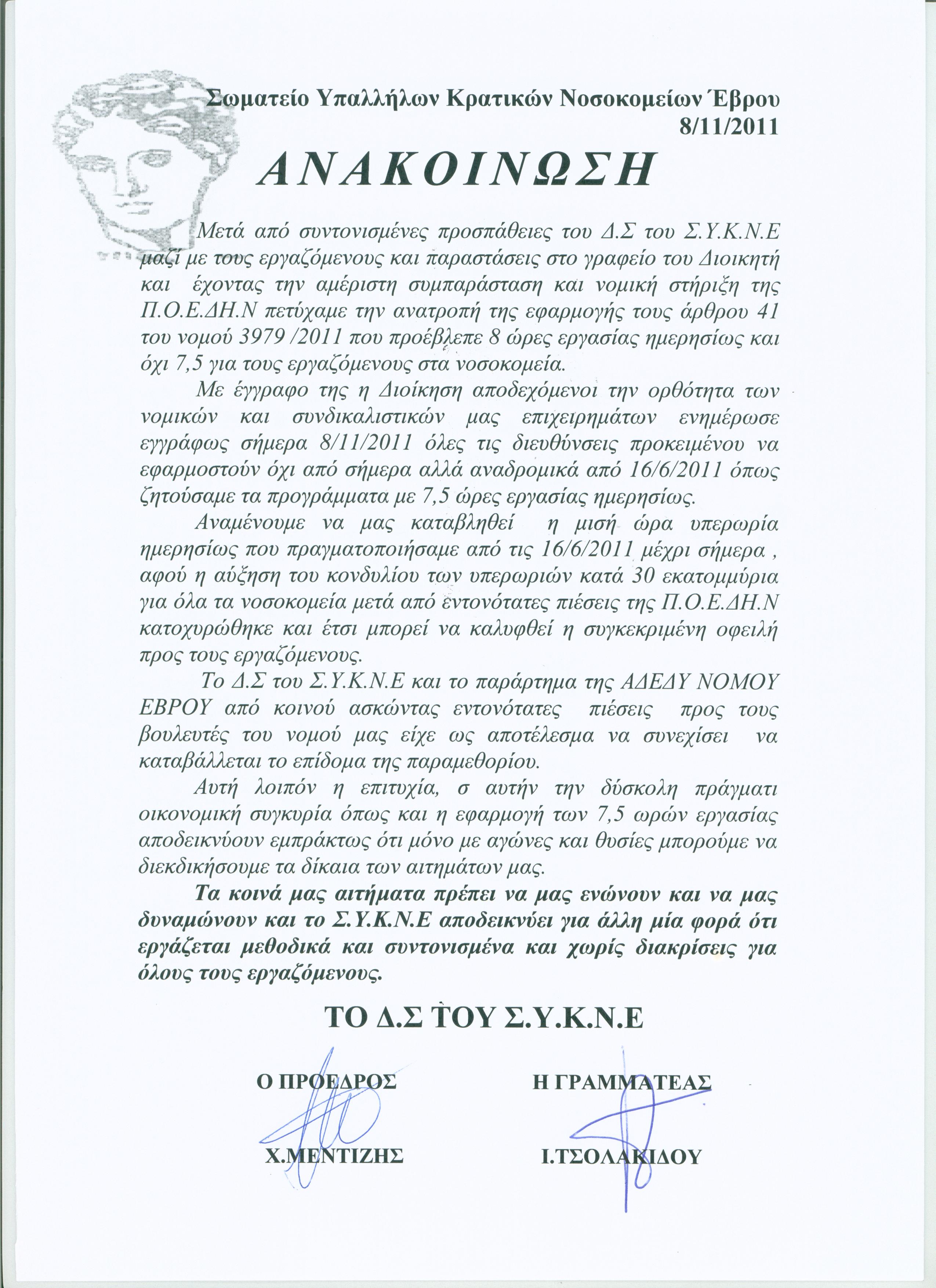 Ανακοίνωση Απέδωσαν καρπούς οι προσπάθειες του Σ.Υ.Κ.Ν.Ε για το ωράριο εργασίας    8.11.2011
